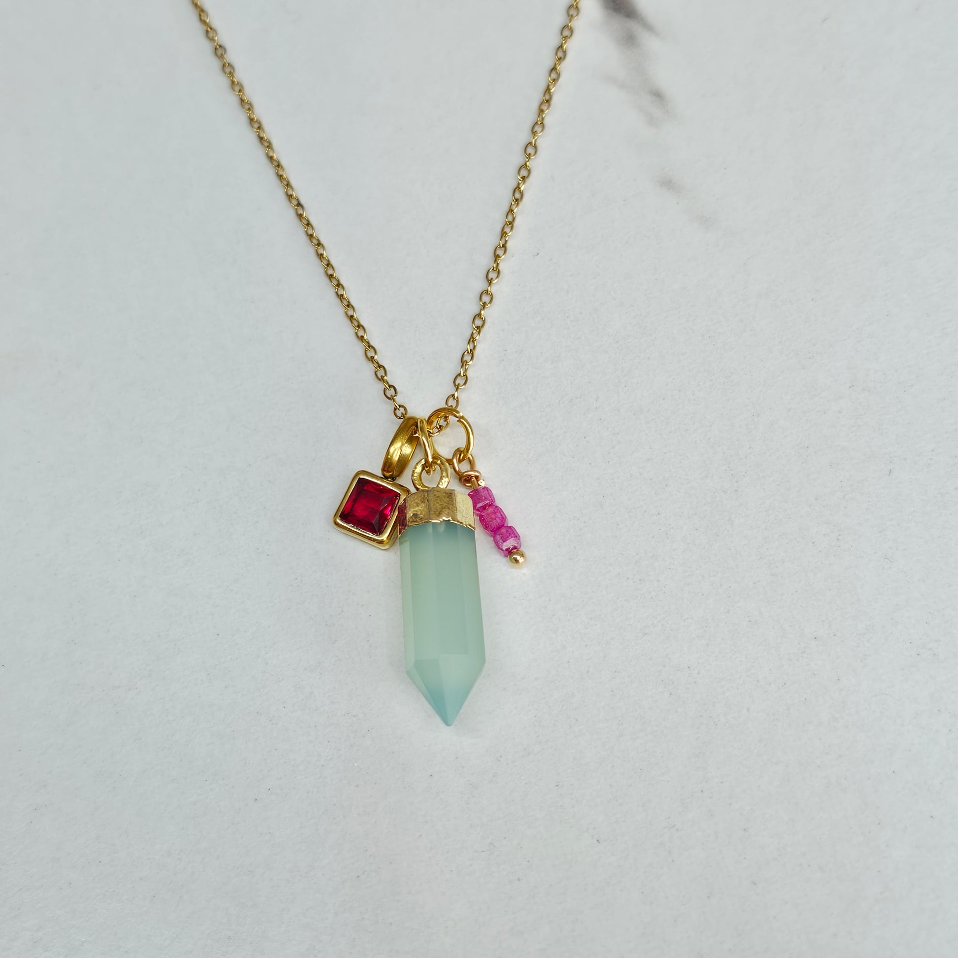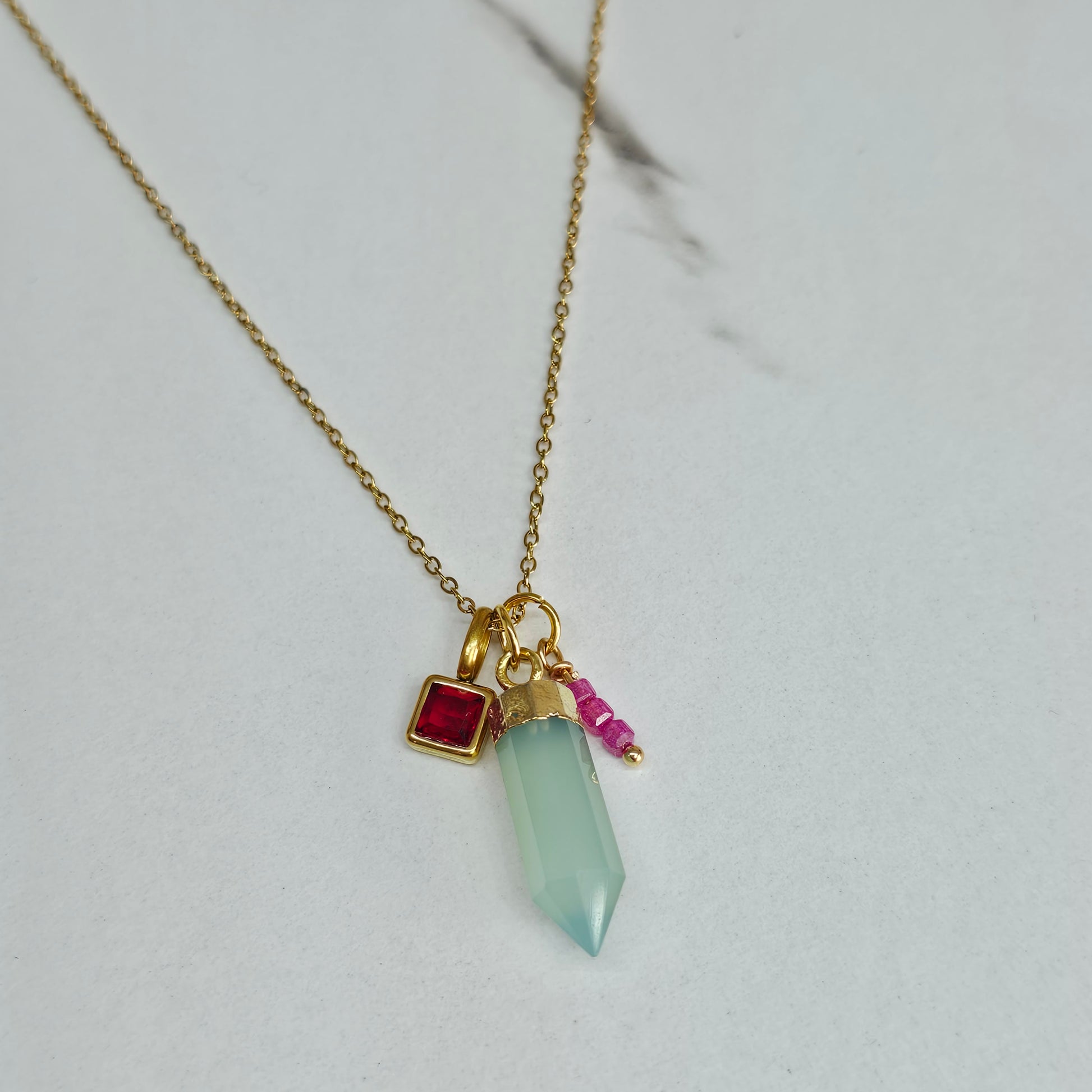 Cadenita en acero dorado y detalles en circonia rosada y roja. Péndulo amazonita.